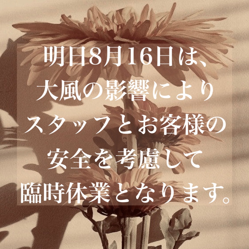 明日、8月16日ですが台風接近中の為、スタッフとお客様の安全を考慮して臨時休業することとなりました。